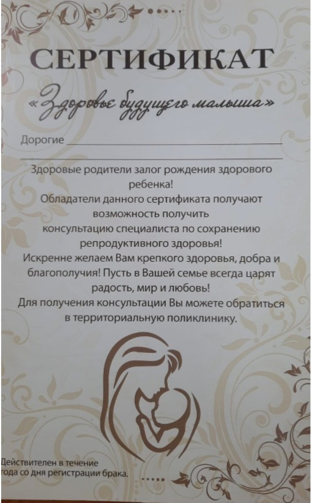 Благодаря сертификату пара может попасть на приём к терапевту, акушеру-гинекологу, хирургу, а также, в случае необходимости, пройти обследование по другим медицинским показаниям без предварительной записи и очереди. Молодожёны получают консультации по здоровому образу жизни, отказу от вредных привычек. Если понадобится им будет назначено лечение. Сертификат "Здоровье будущего малыша" молодые пары получают при регистрации брака.